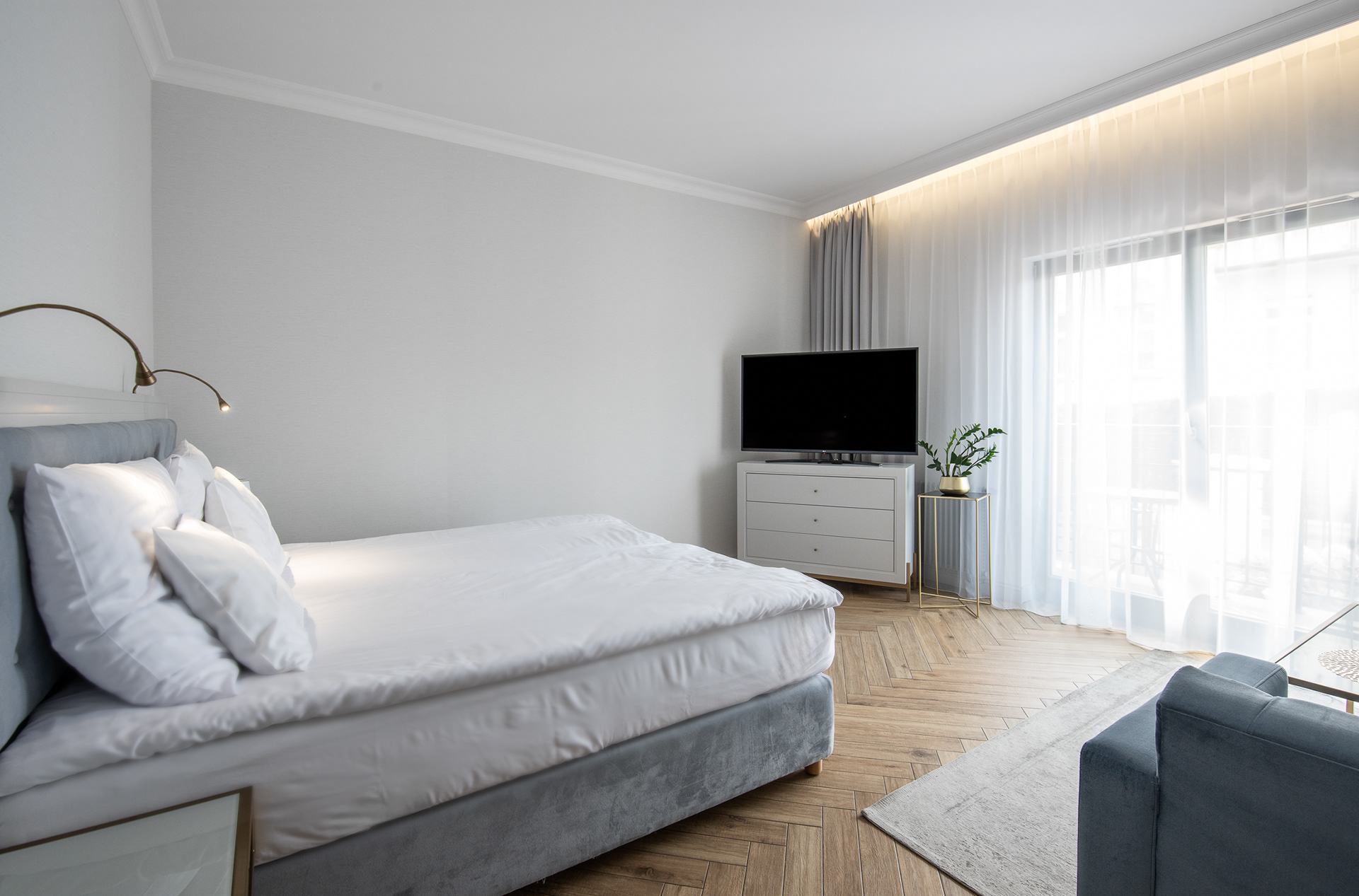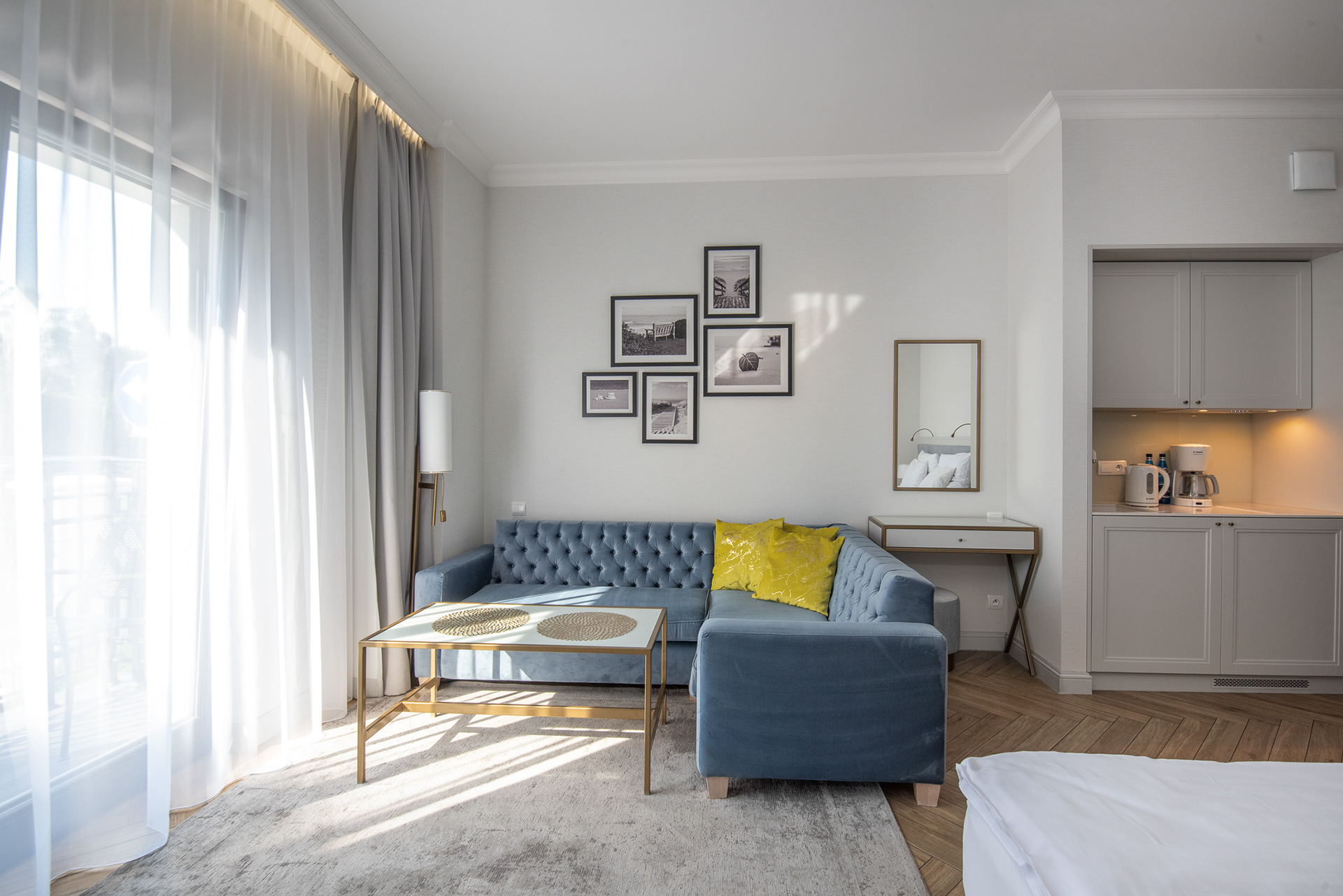 Salon w apartamencie przeznaczonym na wynajem krótkoterminowy — [Miedzyzdroje]. Realistyczne kolory i przestrzeń użytkowa.